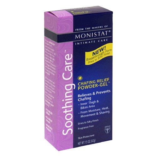 View details ofMonistat Soothing Care Chafing Relief Powder-Gel, 1.5-Ounce Containers (Pack of 3)Made especially for women.NOTE: This product is not intended to treat yeast infections. This powder-gel provides on-the-go daily prevention and relief from chafing and skin irritation in intimate and delicate areas like the inner thigh, bikini area, under the arms and breasts. Made especially for women, the exclusive Powder-Gel formula combines the protective benefits of lotion and powder by forming a silky, breathable moisture-control barrier to fight friction; the breakthrough formula dries to a silky finish. Delicate skin feels healthy and protected from the uncomfortable irritation caused by moisture, heat, movement and shaving. Also helps reduce the appearance of redness that can develop after shaving or waxing the bikini area. Works with just one application and is gentle enough to use every day. Non-greasy, fragrance free, non-irritating and non-staining.You can check the costs for the promotion of the location below